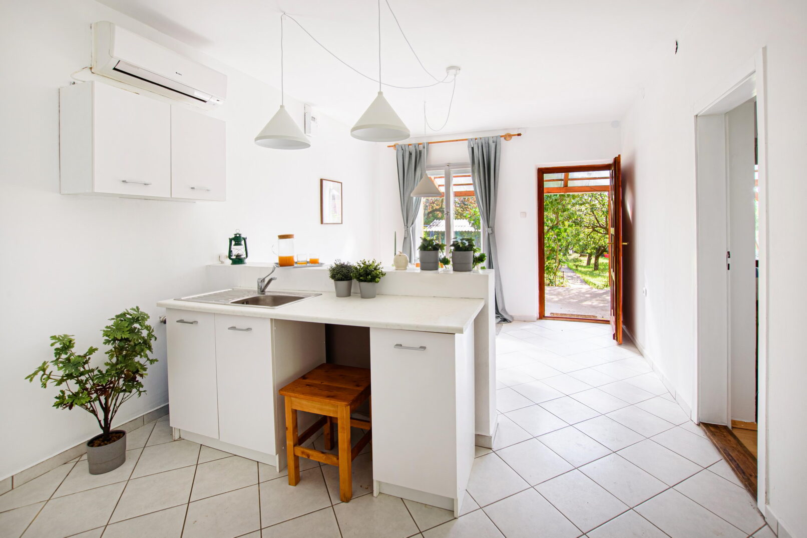 A ház kívülről nagyon szép állapotban van, de belülről azért majdhogynem felújítandó kategória. Sok minden nem fér bele a költségvetésbe, de festeni muszáj. Illetve a csúnya barna ajtókat is lemázoltuk fehérre az optika kedvéért. Ahol kellett lámpákat, de minimum izzókat cseréltünk.