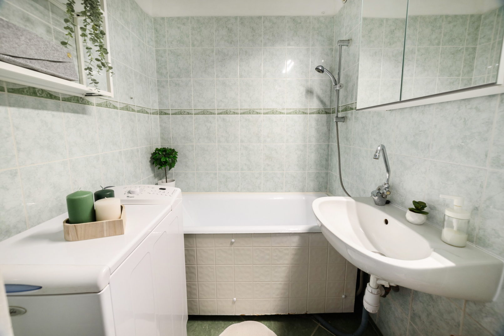 A szobákat újra festettük. A tapéták leszedésére nem volt keret, de újra lehetett festeni őket. Volt izgalom, amikor a fűrészporos tapétát átfestettük vélhetőleg mi már tizedikként! Felpúposodott a vizes festéktől, de mire megszáradt visszasimult a falra! A fürdőben lecseréltük a retró szekrényeket és fénycsövet, új tükrös szekrényre és modern ledes világításra. A kádat kádfestő szakember újította fel.