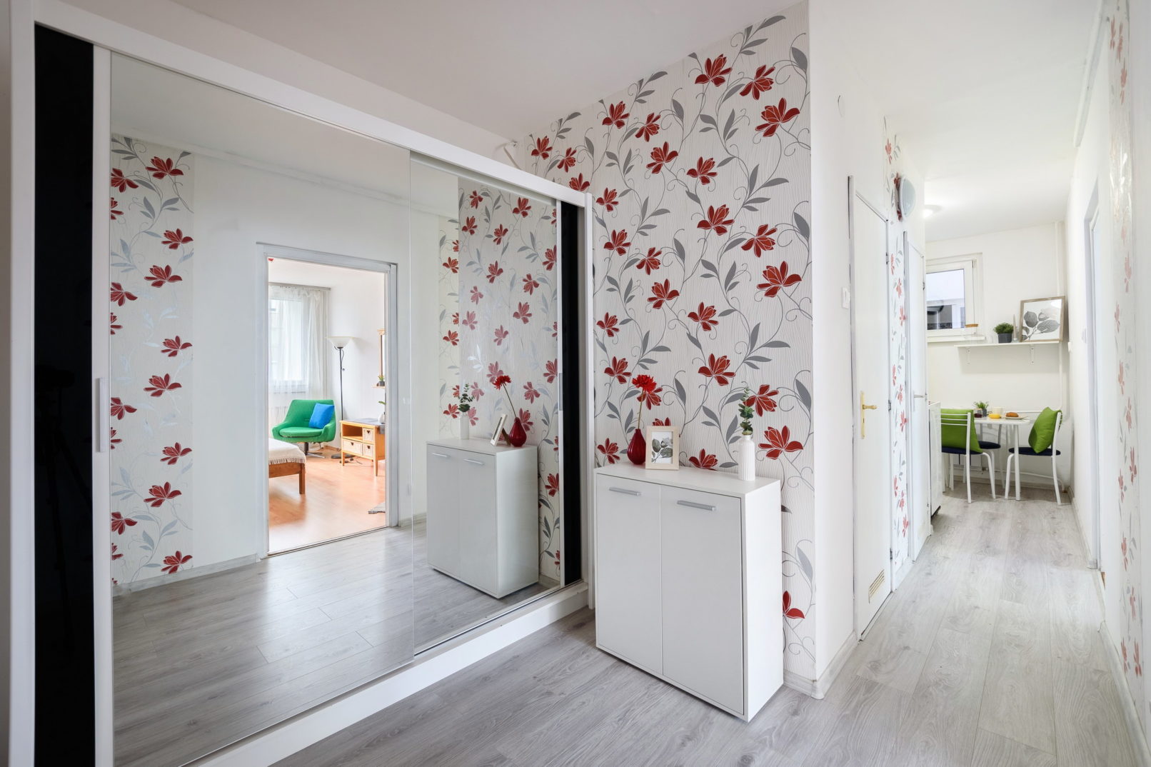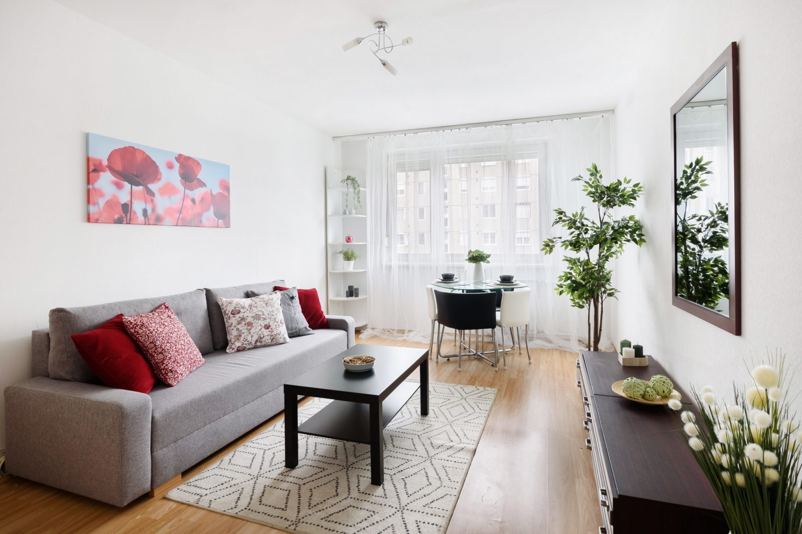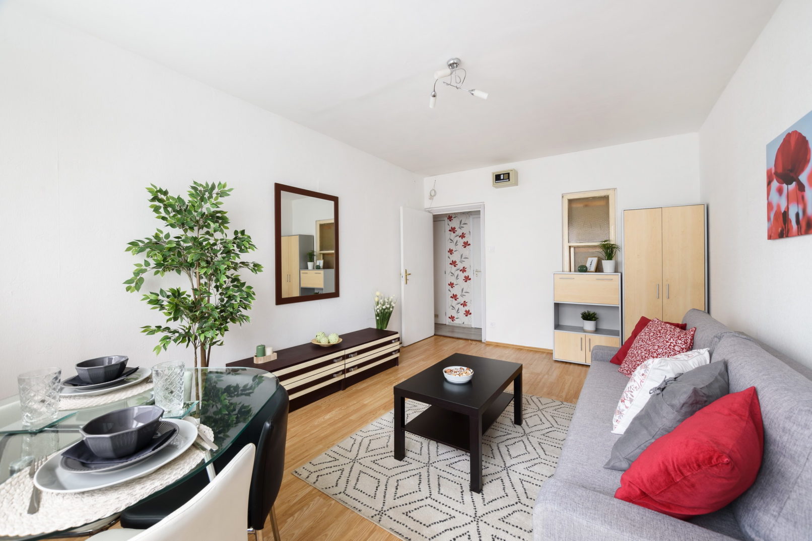 Amikor kicsi a büdzsé, akkor különösen fontos a jó tervezés. Mire költsünk? Mit cseréljünk? Mit használjunk a régi dolgokból? Szerencsére a meglévő bútorok között voltak használható újabb darabok, illetve olyan régebbi retró darabok is, amiket jól be tudtunk illeszteni a berendezésbe. Az előszobában is meg kellet hagyjuk a ‘karakteres’ tapétát, mert elég új volt és csak plusz költség lett volna a leszedés, lejavítás. Így a lakás berendezését, dekorját próbáltuk inkább hozzá igazítani. Szürke, piros dekorokat szedtem össze a lakáshoz. A hiányzó bútorokat, cserélendő lámpákat jófogásról vadásztam le.